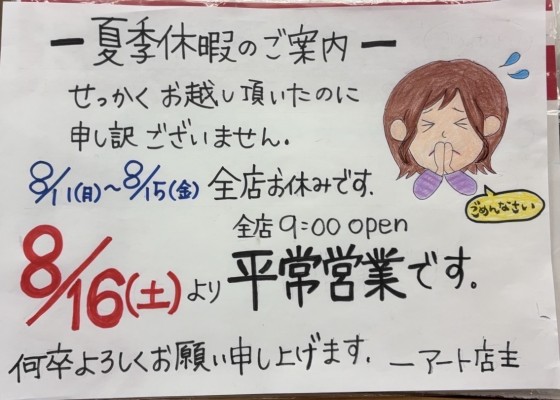 明日8月11日(月)~8月15日(金)の5日間、アート全店夏季休暇です