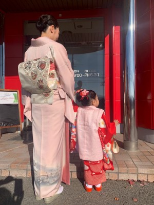 七五三お詣りとお宮参り2025年11月30日(日) ★本店 秋晴れの日、弟さん誕生でお宮参りとお姉ちゃんの三歳の七五三のお詣りです。 お母様と娘ちゃんの着付けとアップを(瀧本・松下コンビで)担当させていただきました。 前日、予行練習を兼ねておばあちゃまがお孫さんに着物を合わせてくれたそうですが、 とっても嫌がって、知らない場所で着付けにアップに大丈夫かなぁと心配されていましたが、 終始ニコニコとってもお利巧さんでした この後お食い初めもされるとの事で被布で楽にしましょうとご提案させていただきました。 お子さまの健やかなご成長をお願い申し上げます